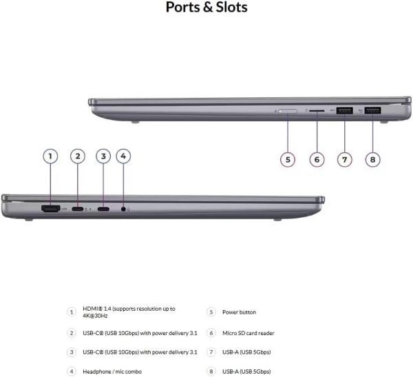 Connectivity includes: 1x USB-A (USB 5Gbps / USB 3.2 Gen 1); 1x USB-A (USB 5Gbps / USB 3.2 Gen 1), Always On; 2x USB-C (USB 10Gbps / USB 3.2 Gen 2), with USB PD 3.0 and DisplayPort 1.4; 1x HDMI 1.4b; 1x Headphone / microphone combo jack (3.5mm); and 1x microSD card reader.
