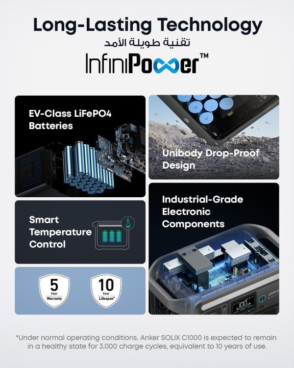 A Decade of Power: Trust in a decade-long journey with the Anker SOLIX C1000 Portable Power Station, featuring exceptional battery longevity with its LiFePO4 Battery, offering 3,000 battery cycles over a 10-year lifespan, ensuring reliability for years to come.