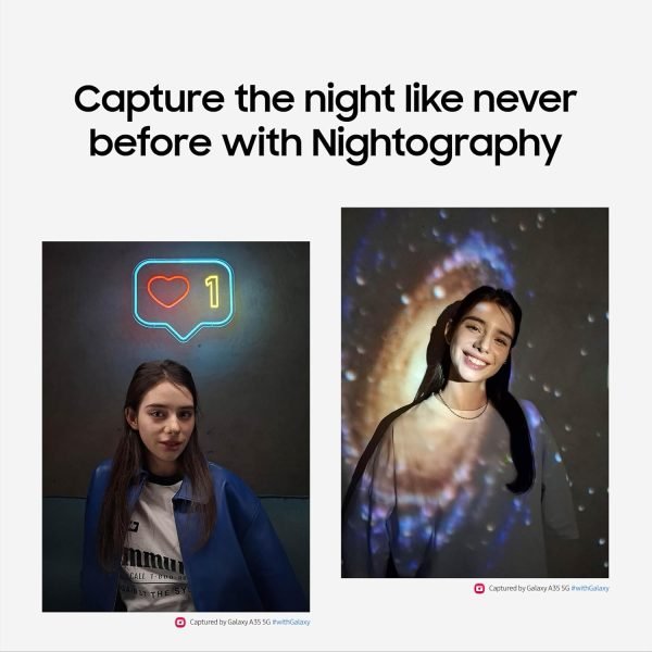 Packed with amazing capabilities, Galaxy A35 5G is designed to bring out the best in every moment. From mountain adventures to local hangouts, the pro-grade camera of A35 5G captures mind-blowing details. Plus, discover more at your fingertips with Circle to Search with Google, allowing you to circle any image on your screen for more details in a snap. Stay out late with friends and capture incredible photos and videos in the dark with Nightography. Whether you’re binge-watching at home or at the park, the brilliantly bright screen shines in any setting. Plus, with expandable storage of up to a massive 1TB³, along with revamped durability, A35 5G has your back, ensuring you conquer your day with unmatched confidence. Awesome experience. Awesome value.