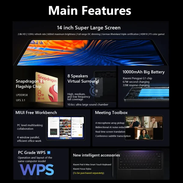 Xiaomi Pad 6 Max is equipped with a 14-inch 2.8K LCD display, brings your photos and videos to life. MIUI 13.0 OS ensures you a more wonderful user experience. Powered by Snapdragon 8+ Gen 1 Octa-core processor, offers you smooth operation and a stable multitasking experience. 50.0MP+2MP Rear cameras + a 20.0MP front camera for capturing memorable moments and high-quality pictures in daily life.
